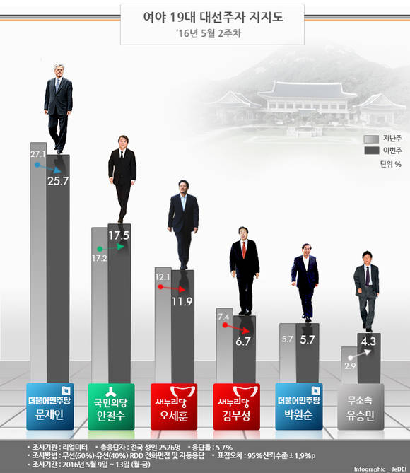 이어 안 대표는 언론 진실 왜곡 해명 트위터 방송과 군부대 방문 관련 보도가 이어지며 0.3%p 반등한 17.5%2위 자리를 이어갔으며, 새누리당 혁신위원장직을 거절한 것으로 알려진 오세훈 전 서울시장은 0.2%p 하락한 11.9%3위를 유지한 것으로 조사됐다.