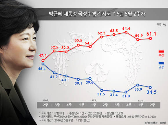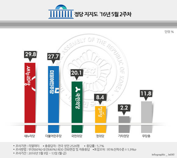 정당지지도에서는 새누리당은 0.6%p 하락한 29.8%, 지난 3주 동안 이어지던 상승세가 꺾이며 20%대로 내려앉았고, 더민주당 역시 0.1%p 하락한 27.7%3주 연속 27%대를 기록했으며, 사무총장 등 주요 당직 인선을 완료한 국민의당 또한 1.7%p 내린 20.1%2주 연속 하락하며 20%대 초반으로 떨어지는 등 원내지도부가 청와대회동에 참여한 여야 3당이 모두 하락한 것으로 나타났다.