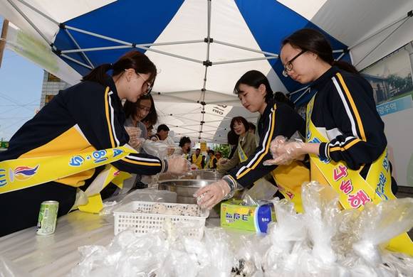 ▲광주송정역에서 '5월愛 주먹밥나누기' 행사에 참가한 학생들이 주먹밥을 만들고 있다.(사진=광산구)