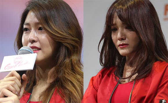 ▲설현(왼쪽)과 지민이 16일 열린 AOA 컴백 쇼케이스 무대에서 최근 불거진 역사의식 논란에 대해 사과의 말을 전하며 눈물을 흘렸다.(사진=연합뉴스)