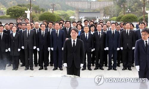 ▲국민의당 안철수 대표와 광주·전남 지역 당선자들이 17일 오전 광주 북구 운정동 국립 5·18민주묘지를 찾아 참배하고 있다.(광주=연합뉴스)
