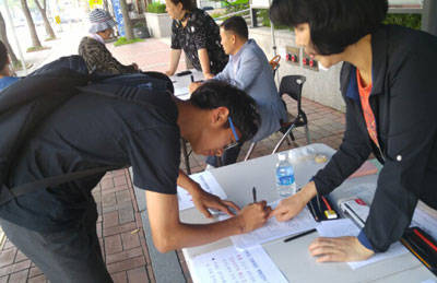 ▲성남시 수정구 양지동 주민센터 앞에서 시민들이 서명을 하고 있다.