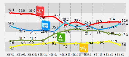 정당 지지율 조사에서는 새누리당 지지율은 전주보다 0.2%p 상승한 30.6%였으며, 더민주당 지지율은 전주보다 4.3%p 급등한 28.4%를 기록한 반면, 국민의당은 전주보다 1.2%p 추락한 17.3%를 기록하며 5월 들어 계속 하락세를 보였으며, 정의당은 전주보다 3.4%p 하락한 6.9%였고 무당층은 16.9%로 나타났다.
