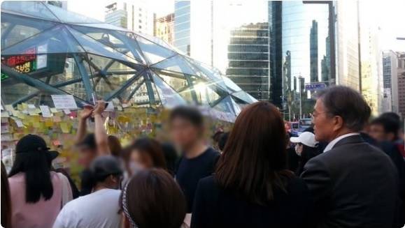 이 같은 사실은 한 트위터리안이 이날 오후 7시 10분경 "현재 강남역 10번 출구에 더불어민주당 문재인 전 대표님이 주위에 보좌관도 없이 혼자 저렇게 계시네요. 많은 분들이 꽃과 함께 포스트잇을 쓰고 계시다"는 글과 함께 문 전 대표의 모습이 담긴 사진을 게재하는 바람에 알려졌다.