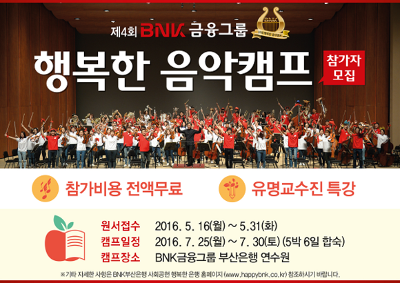 BNK금융그룹(회장 성세환)이 오는 7월 25일부터 5박 6일간, 부산은행 연수원에서 국내외 음악전공자 100여명을 선발해 '제4회 BNK행복한 음악캠프'를 개최한다.