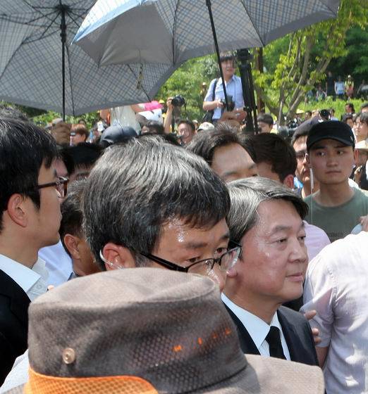 결국 국민의당 지도부는 추도식 후 경호를 받으며 쫓기듯 현장을 떠나야 했다. 경호원들은 우산을 준비해 혹시나 모르는 물세례에 대비하는 모습을 보였다.
