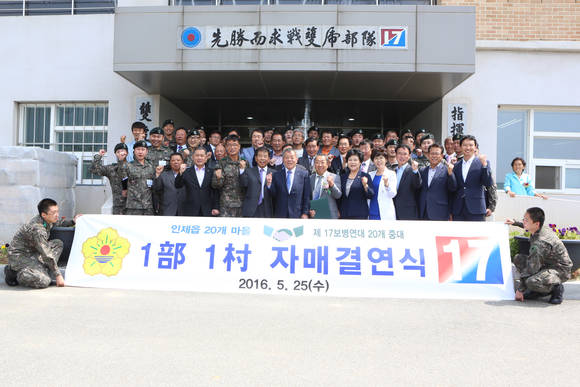 인제읍에 따르면 25일 육군 제17보병연대에서 안덕수 부군수, 강순복 군의회 부의장, 엄윤순 의원, 이용만 인제읍 이장협의회장, 주원식 육군 제17보병연대장, 인제읍 이장단 및 기관 단체장 등 지역주민 120여명이 참석한 가운데 1부 1촌 자매결연식 및 육군 제17보병연대 부대 개방 행사를 가졌다.