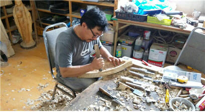 ▲전통생활 목기를 제작하고 있는 박영식(54) 씨.