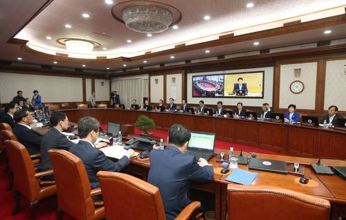 ▲24일 오전 서울 세종로 정부서울청사에서 열린 세종-서울 간 영상국무회의에서 국무위원들이 유일호 경제부총리 겸 기획재정부 장관의 발언을 경청하고 있다.(사진=연합뉴스)