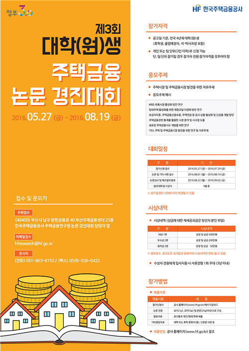 주택금융공사(사장 김재천)는 대학(원)생들의 창의적 아이디어를 발굴해 공사 사업 등에 활용하기 위해 '제3회 대학(원)생 주택금융 논문 경진대회'를 개최한다고 27일 밝혔다.