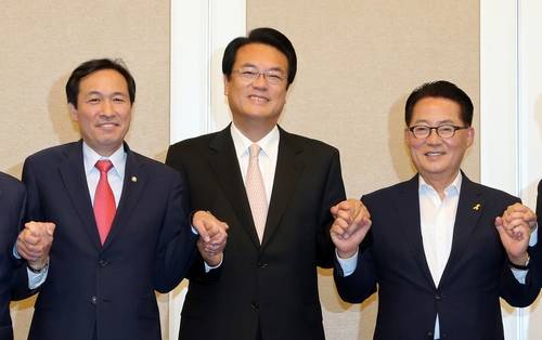 ▲새누리당 정진석 원내대표(가운데), 더불어민주당 우상호 원내대표(왼쪽), 국민의당 박지원 원내대표가 19일 오후 국회 귀빈식당에서 열린 20대 원 구성 협상을 위한 첫 회의에서 서로 손을 잡고 있다.(사진=연합뉴스)
