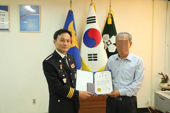 수원중부경찰서(서장 김태수)는 지난 24일 수원시 장안구 정자동 소재 모 은행에서 택시에 승객으로 탑승한 중국인 2명이 1600여만 원 상당의 현금이 들어있는 노란 봉투를 든 상태로 대화하자 목적지에 하차 시킨 후 맞은편에서 이들을 지켜보며 112에 신고한 송 모(58세,남)씨에 대해 유공자 표창과 신고포상금을 전달했다.
