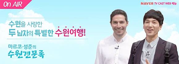 수원시가 오는 6월 1일부터 전국 지자체 최초로 네이버 TV캐스트 전용관을 통해 수원의 숨은 매력을 소개하는 웹예능 프로그램 마르코&성준의 수원견문록을 선보인다.