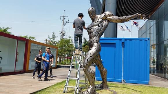 조정래 작가의 3.4m 높이의 대형작품 Human-11은 미술관 방문하는 누구든 눈길을 끌기 충분하다. 단단한 철근과 철판 등을 이용해 과장된 양감이 불어넣어진 인체의 형상이 미술관과 컨테이너 밖으로 뛰쳐나가는 듯하다.