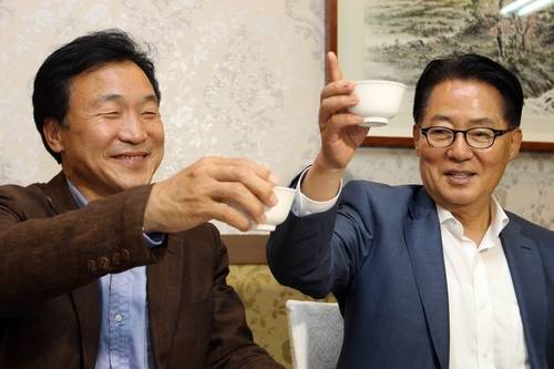 ▲더불어민주당 손학규 전 상임고문(왼쪽), 국민의당 박지원 원내대표가 3일 오후 전남 목포의 한 식당에서 함께 막걸리를 마시고 있다. 박 원내대표는 이날 손 전 고문과의 만남이 '러브콜'이 아니라고 밝혔다.(목포=연합뉴스)