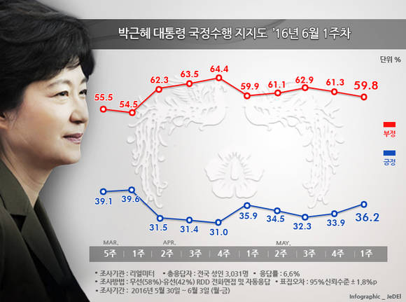 여론조사 전문기관 <리얼미터>가 5월 30일~6월 3일 닷새간 전국 성인 3천31명을 대상으로 박 대통령의 국정수행 지지도 6월 1주차 조사결과에 따르면 국정수행 지지도(긍정 평가)는 전주 대비 2.3%포인트 오른 36.2%로 2주 연속 올랐다.
