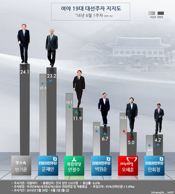 그리고 대선 후보 지지도 조사에서는 리얼미터 주간정례조사에 처음으로 포함된 반기문 유엔 사무총장이 여야 경쟁 주자 대부분의 지지층을 흡수해 24.1%를 기록해 더불어민주당 문재인 전 대표를 오차범위 내인 0.9%포인트 차이로 앞서 1위에 올랐다.