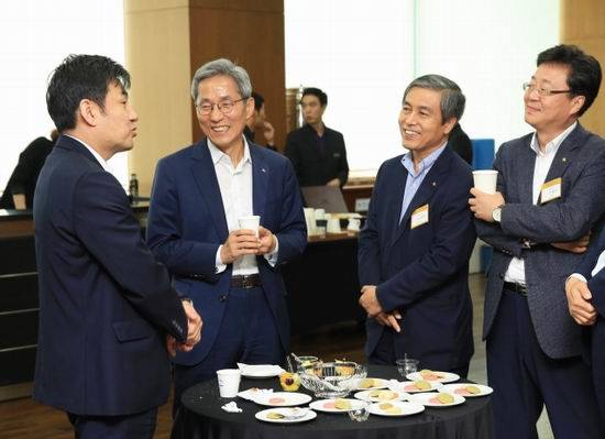 ▲윤경은 현대증권 사장, 윤종규 KB금융그룹 회장, 김옥찬 KB금융지주 사장, 전병조 KB투자증권 사장(왼쪽부터)이 지난달 27일 경기도 용인에 있는 현대인재개발원에서 열린 통합워크숍에서 담소를 나누고 있다. (KB금융 제공)