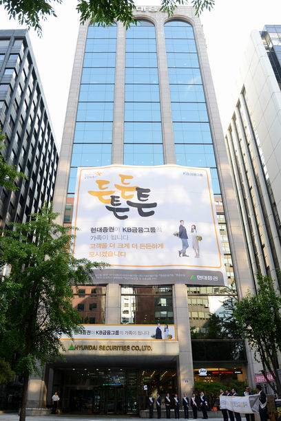 ▲현대증권을 품에 안은 KB금융이 거대 통합증권사 출범에 속도를 내고 있다. 사진은 현대증권 여의도 본사 사옥. ‘KB금융과 한가족이 되었다’는 내용의 플래카드가 걸려 있다. (KB금융 제공)