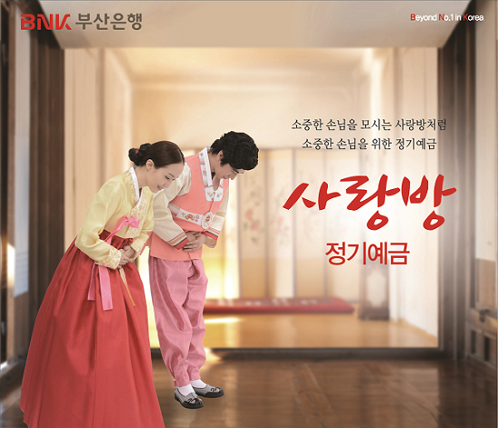 '사랑방 정기예금'은 부산은행이 계좌이동제 시행에 따라 주거래 고객에게 추가 우대이율을 지급하는 예금상품으로 부산은행과 거래하는 모든 고객을 '소중한 손님'으로 모신다는 의미로 네이밍 되었다.