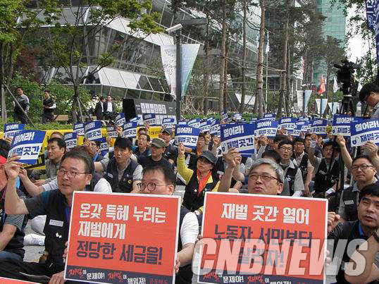 ▲민주노총과 재벌책임공동행동 등 노동·시민단체 회원들이 지난달 25일 서울 소공동 롯데백화점 본점 앞에서 대기업들의 사내유보금 집행을 촉구하는 집회를 열고 있다. (사진=이성호 기자)