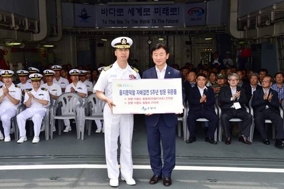 수원시가 6월 호국보훈의 달을 맞아 8일 자매결연을 맺고 있는 해군 2함대 을지문덕함을 방문, 위문품을 전달하고 장병들의 노고를 격려했다.