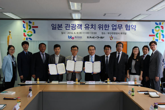 협약식에는 심정보 부산관광공사 사장, 정용문 한국관광공사 부산울산지사장, 해피월드 이마무라 마사즈미 대표가 참석했다.
