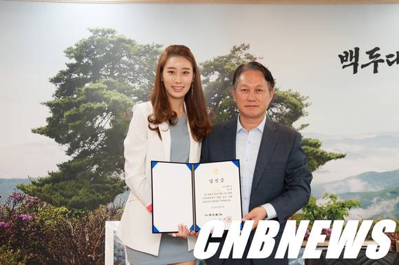 ▲미스코리아 강원 예선 '미' 장휘 학생 김연식 태백시장과 기념촬영(사진=태백시청 제공)