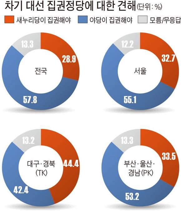 또한 TK에서는 “새누리당이 집권해야 한다”가 44.4%로, 야당 집권을 바라는 의견 42.4%보다 2%p 많았다. 지역별로는 TK를 제외한 전 지역에서 정권 교체 요구가 정권 재창출 요구를 앞질렀다.