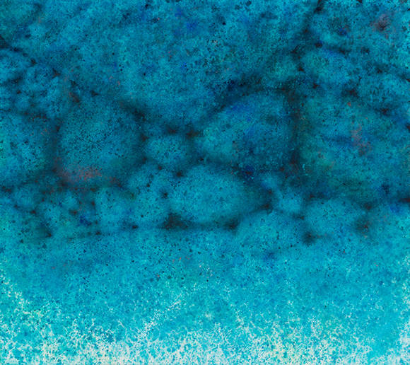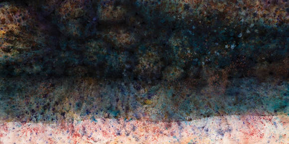 그 위에 물감을 뿌리고 붓질하는 과정을 수십 차례 반복한다. 물감이 번지고 마르며 생기는 즉흥적이고 우연한 흔적들과, 안료의 소밀을 조율해가며 화면 전체를 채우고 쌓아간다. 그 후 물감이 마무리된 그림 표면에 스크래치를 내 그림 흔적의 질감과 실루엣, 작가의 사인을 표면에 새긴다.