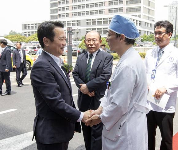 ▲13일 오전 수원 아주대학교 의료원 경기남부 권역외상센터 테이프 컷팅식에서 남경필 경기도지사가 이국종 권역외상센터장과 인사를 나누고 있다.(사진=경기도)