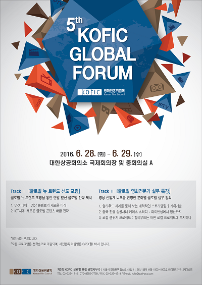 영화진흥위원회(위원장 김세훈)는 오는 28일부터 29일까지 대한상공회의소에서 국내외 주요 영화 및 영상미디어 업계 관계자들을 대상으로 '제5회 KOFIC 글로벌 포럼'을 개최한다고 14일 밝혔다.
