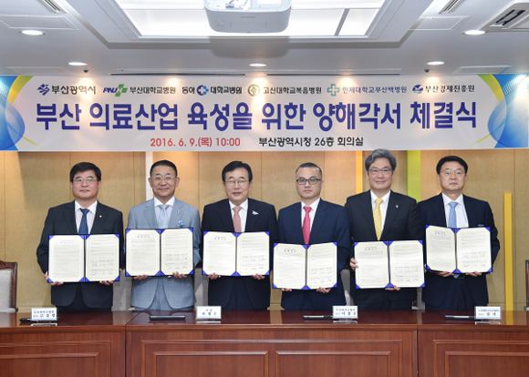 부산대병원(병원장 이창훈)은 최근 부산시, 부산경제진흥원, 고신대복음병원, 동아대병원, 인제대 부산백병원과 함께 부산지역의 보건의료산업 체질 강화와 일자리 창출 등에 대한 '보건의료산업 육성 양해각서'를 체결했다고 14일 밝혔다.