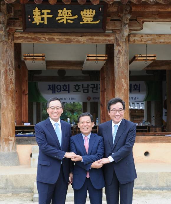 ▲왼쪽부터 송하진 전북도지사, 윤장현 광주광역시장, 이낙연 전남도지사(사진=광주시)