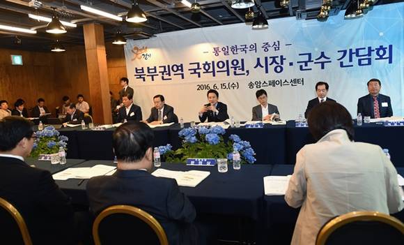 ▲15일 양주 송암스페이스센터에서 열린 북부권역 국회의원 시장군수 간담회에서 남경필 경기도지사가 의견을 청취하고 있다.(사진=경기도)