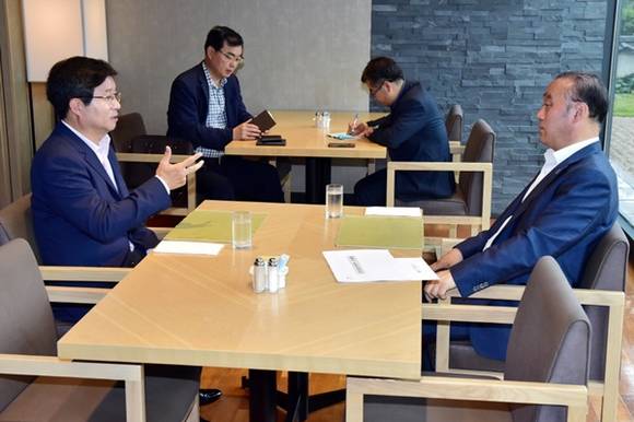 ▲대구시장과 만나 지방재정 개편안의 부당성을 설명하고 있는 염태영 수원시장(사진=수원시)