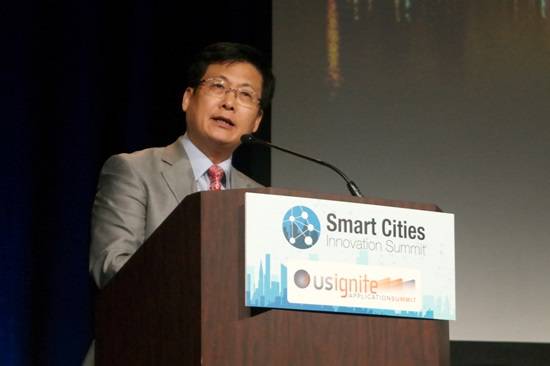 ▲미국을 방문 중인 최성 고양시장이 미국 텍사스주에서 열린 '스마트시티 이노베이션 서밋'에서 기조연설을 하고 있다.(사진= 고양시)