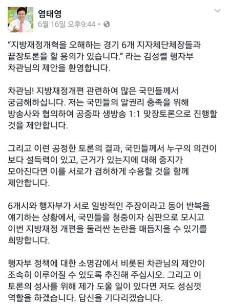 염태영 수원시장은 지난 16일 밤 자신의 페이스북을 통해 김성렬 행정자치부 차관의 끝장토론 제안을 환영하는 글을 남겼다.