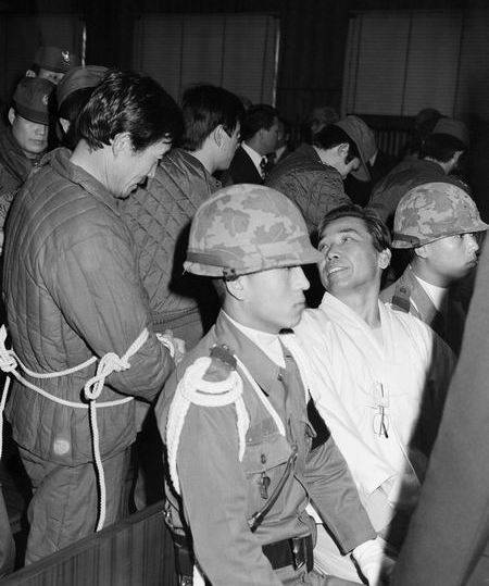 ▲1979년 12월 8일 박정희 대통령을 시해한 뒤 공개재판을 받고 있는 김재규 중앙정보부장. 함께 행동했던 직속부하 박흥주와 박선호에게 뭔가 말하고 있다. 신군부 세력은 이날 재판 직전에 김재규의 비리를 발표했는데 그 중의 일부가 ‘김재규 집에서 고서화 1백여점이 발견됐다’는 것이었다. ‘미인도’는 이렇게 탄생한 것으로 짐작된다. (사진=문화체육관광부 e영상역사관)