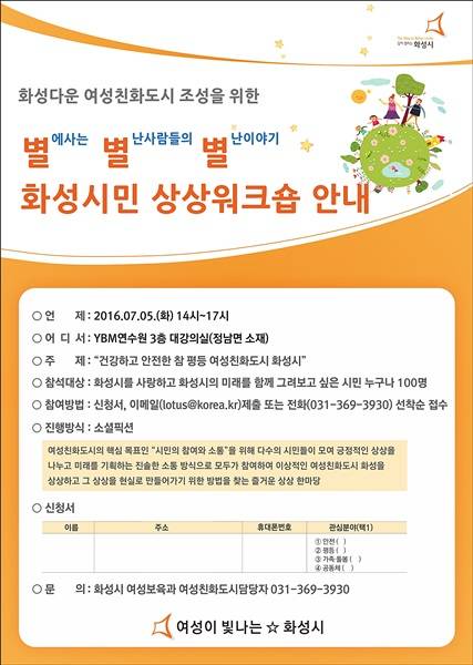 화성시가 건강하고 안전한 참 평등 여성친화도시를 시민들과 직접 그려보는 별별별 상상워크숍을 오는 7월 5일 YBM연수원에서 개최한다.