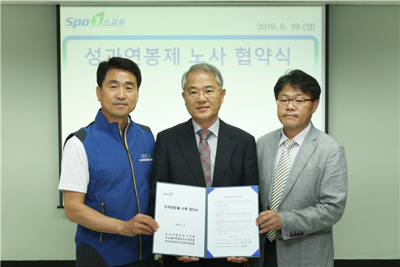 ▲스포원 김병곤 이사장(가운데)과 양측(복수노조) 노조위원장(왼쪽 권용현, 오른쪽 노병래)이 직원 성과연봉제 협약식에 사인을 한 후 기념촬영을 하고 있다. (사진제공=스포원)