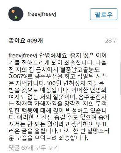 이후 자신의 SNS에 음주운전 사실을 올리고 무책임한 행동에 깊이 반성하고 있다고 몸을 낮췄다.