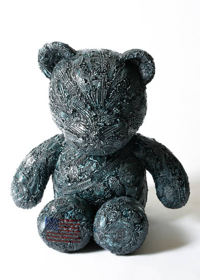 ▲류지항, '테디 베어(Teddy Bear) - 압착된 장난감'. 초산 비닐 수지, 목탄, 우레탄, 60 x 65 x 70cm. 2015.