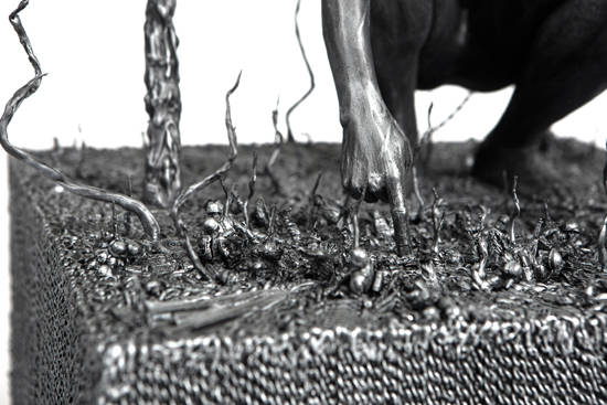 ▲류지항, '프레셔(Pressure) - 압착된 장난감'. 목탄, 먹, 초산 비닐 수지, 48 x 48 x 100cm. 2016.