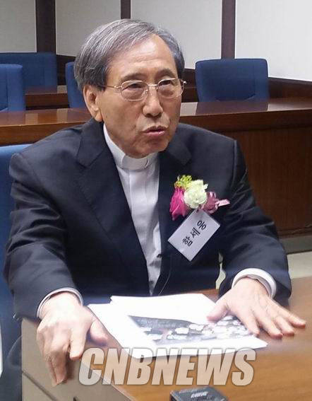 ▲함세웅 신부가 지난 16일 국회에서 열린 ‘김근태기념치유센터 개소 3주년 고문피해자 지원의 날’ 행사에서 인사말을 하고 있다. 함 신부와의 인터뷰는 이 행사가 끝난 뒤 진행됐다. (사진=도기천 기자)