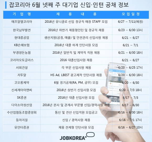 6월 넷째 주 수산업협동조합중앙회·신세계아이앤씨·SK증권·현대중공업·서희건설 등이 신입공채를 시작한다. 한국남부발전, KB손해보험, 유안타증권은 인턴사원을 모집한다.