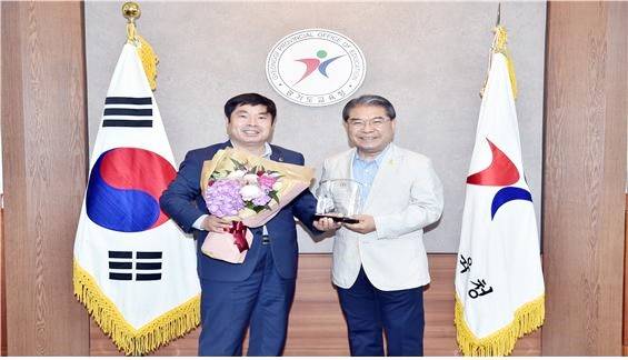 정대운 경기도의회 예산결산특별위원회 위원장(더불어민주당)이 27일 오전 경기도교육감실에서 이재정 경기도교육감으로부터 감사패를 수상했다.