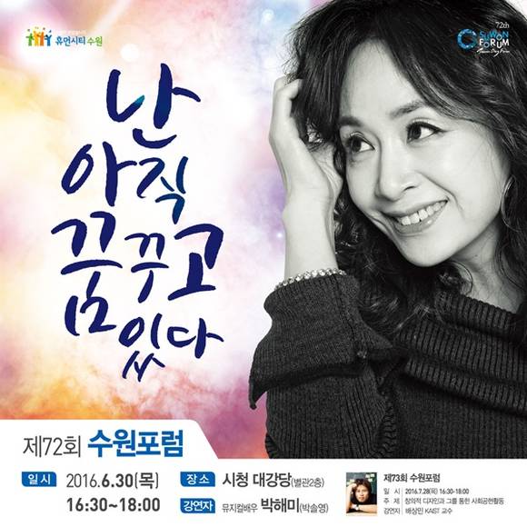 수원시는 오는 30일 시청 대강당에서 배우 박해미를 초청해 ‘난 아직 꿈꾸고 있다’라는 주제로 제 72회 수원포럼을 개최한다.
