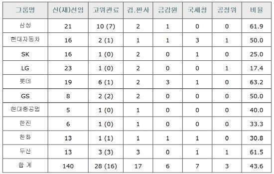 ▲10대 그룹의 올해 3월 정기 주주총회에서의 신임(재선임) 사외이사 숫자. <단위: 명, %, ( )장·차관 출신> (자료=재벌닷컴)