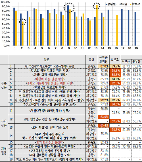 또한, '교육공무원 인사의 공정성'에 대한 공무원·교직원 대상 조사에서는 83.1%가 대체로 공정하다고 말했으며, '부산 다행복학교 운영'에 대한 학부모 조사에서는 73.5%가 만족한다고 응답하는 등 비교적 높은 평가를 받았다.